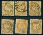 Planche med 6 x 3 øre orange stolpemærker i blandet kvalitet.